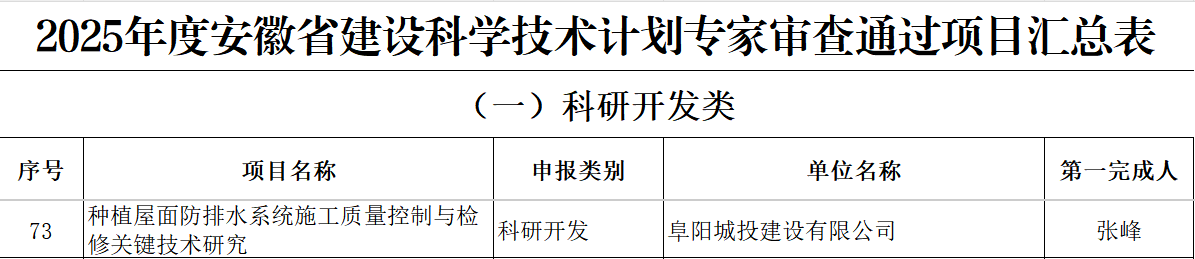 近日,安徽省住房和城鄉(xiāng)建設(shè)廳公示了2025年度安徽省住房和城鄉(xiāng)建設(shè)科學(xué)技術(shù)計劃項目名單,城建公司牽頭承擔(dān)的種植屋面防排水系統(tǒng)施工質(zhì)量控制與檢修關(guān)鍵技術(shù)研究成功入選。